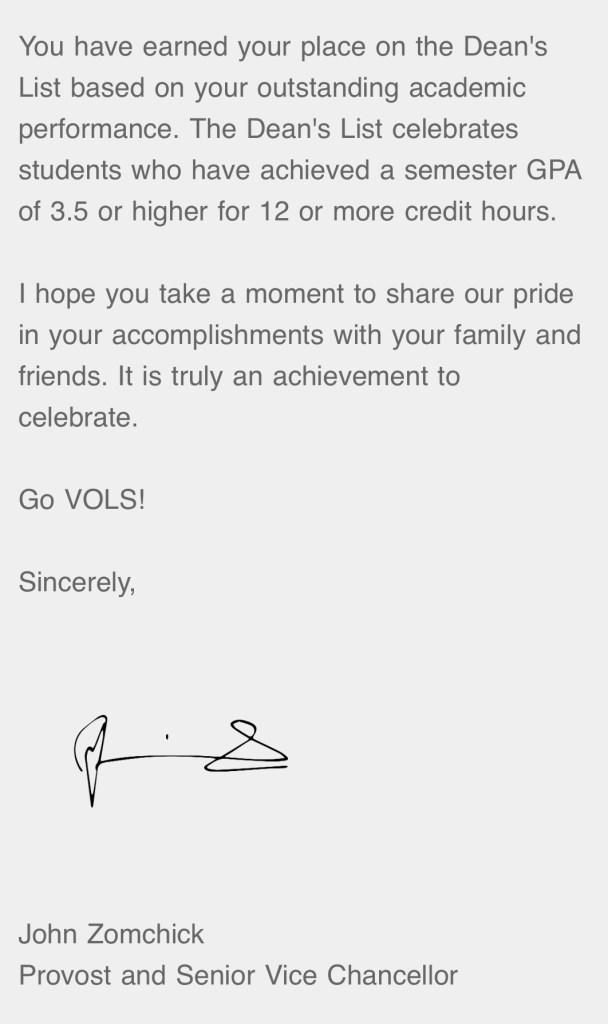 I made the dean’s list last semester, Summa Cum Laude. I ended with a 4.0 for this semester and a 3.79 overall.